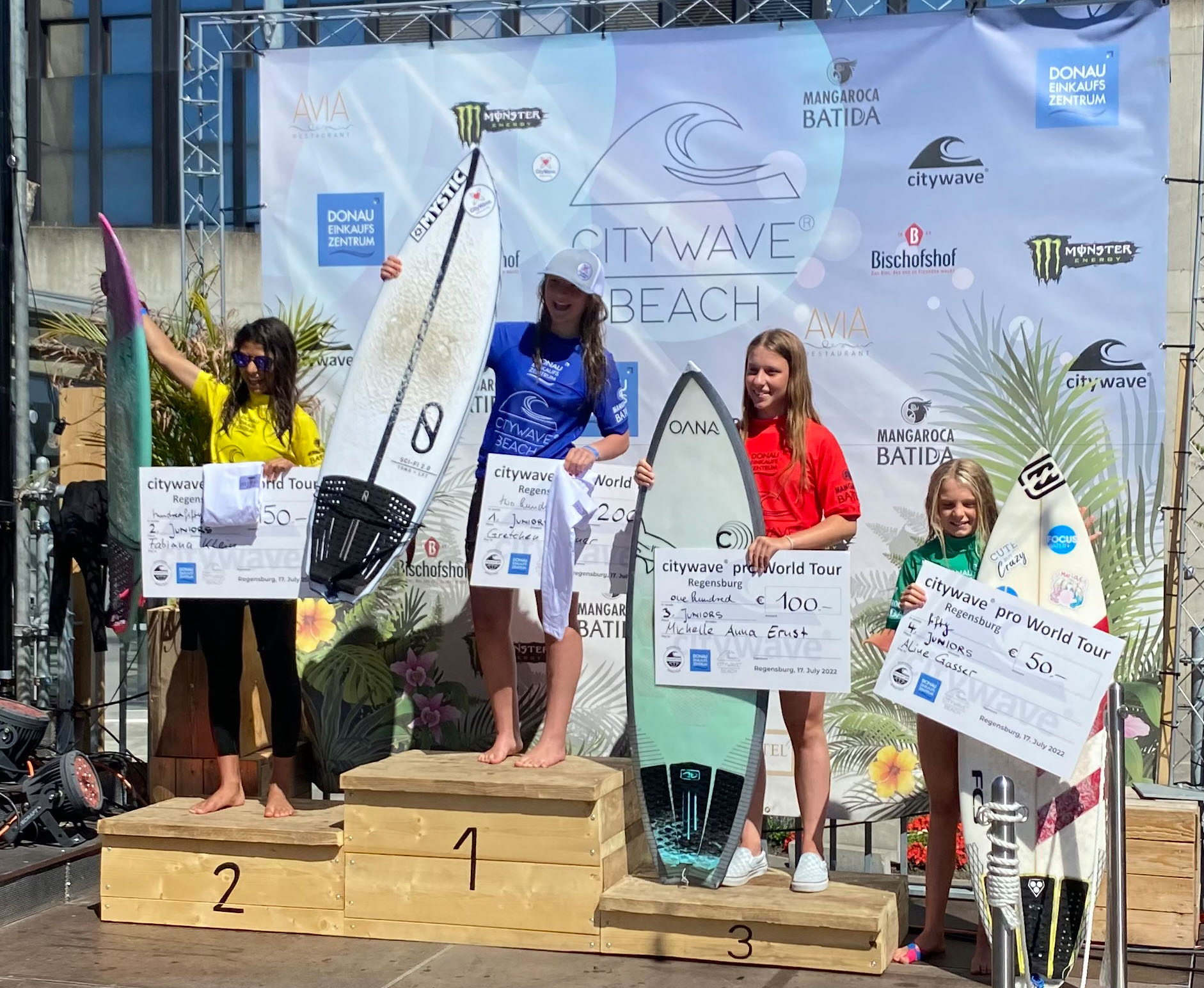 Nach zwei Jahren Corona Pause konnte die CityWave Surf Pro Worldtour im bayrischen Regensburg fortgesetzt werden. Auf der stehenden Welle gewann Gretchen Steiner aus Wien die Junior Girls Klasse. Zunächst musste sie den Umweg über die Hoffnungsrunde nehmen, konnte dann aber im Semifinale und Finale ihre Klasse ausspielen. Die 14-jährige dominierte mit schnellen Surfturns, 360 Manövern und landete sogar gesprungene Air-Reverse 360 Tricks, die man selbst in der allgemeinen Klasse nicht sehr oft zu sehen bekommt.