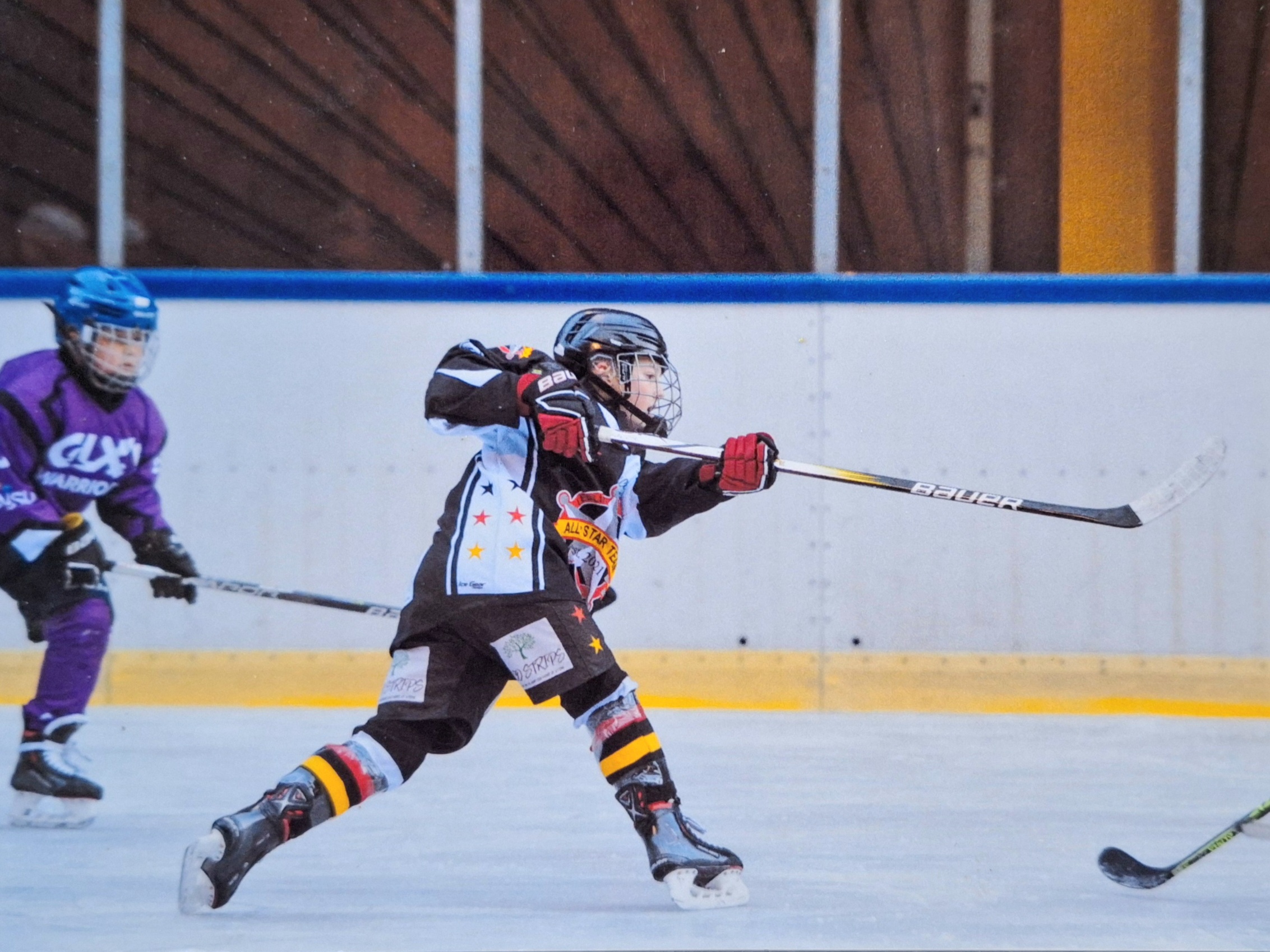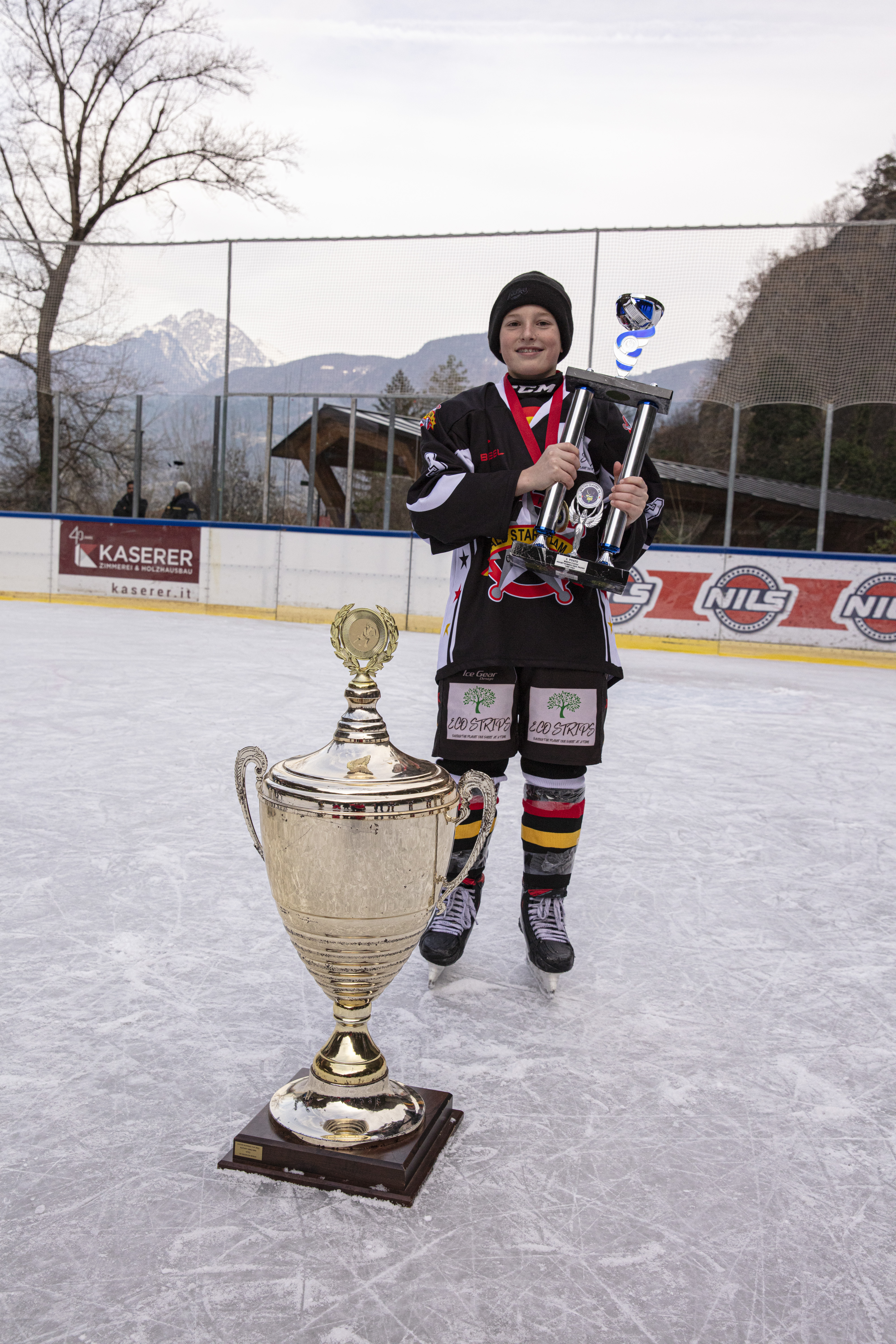 Raphael Sperger (2U) freut sich über den Turniersieg mit seiner Select Mannschaft LHD All Stars aus Deutschland beim Winter Classics Turnier in Italien. Es war ein wunderschönes Ambiente für die Spieler und Zuschauer zwischen den Bergen Südtirols.